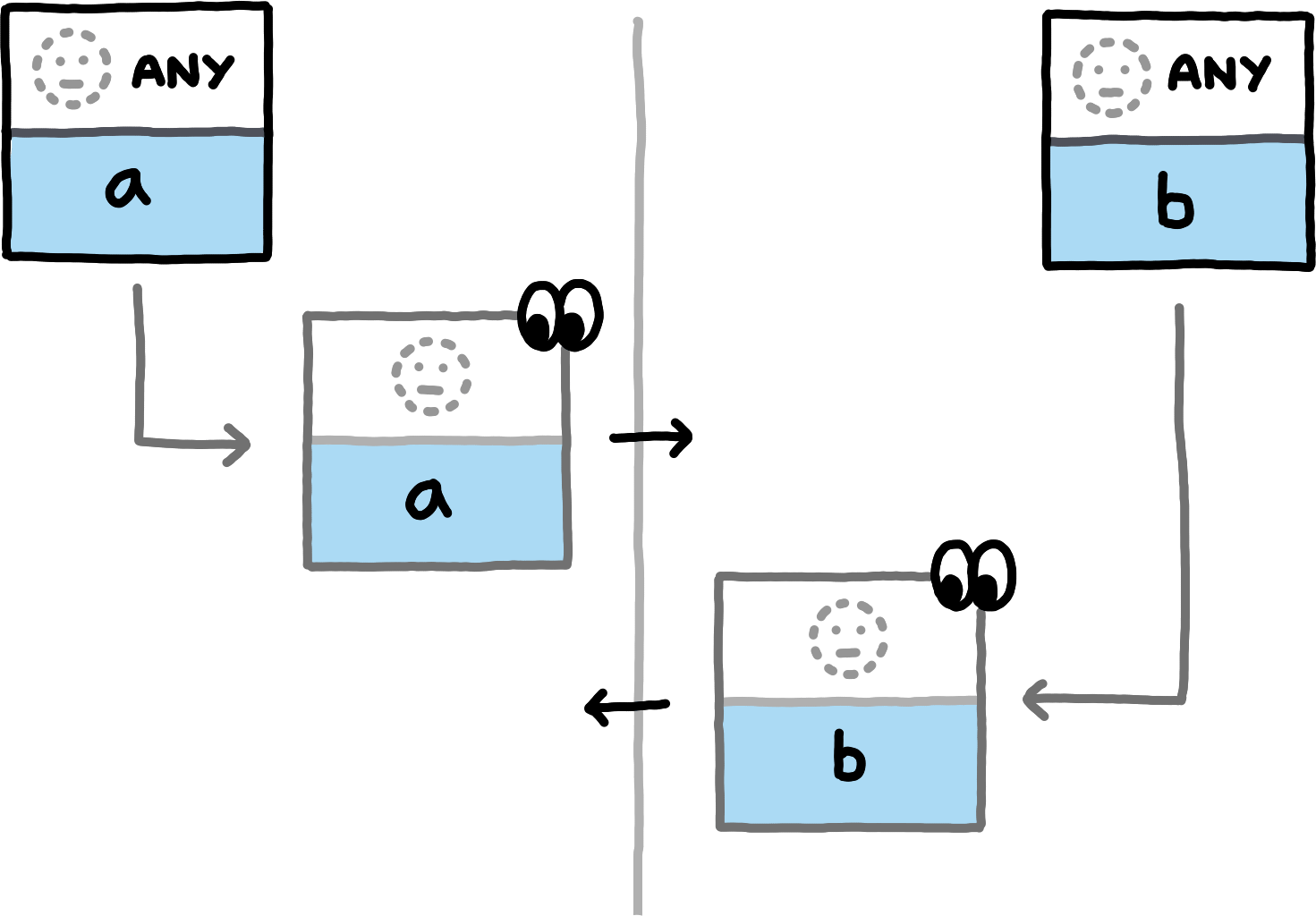 The exchange of read capabilities that we have described so far works for pairs of PrivateInterests where one is more specific than the other. This is not the case for awkward pairs, however. The peer who detects the overlap cannot send its own read capability for the same reason as in all other cases: the Path is an extension of the Path that the other peer knows about, so it must not be transmitted blindly. But the other peer cannot send its read capability either, because it contains a SubspaceId that must not be disclosed blindly.