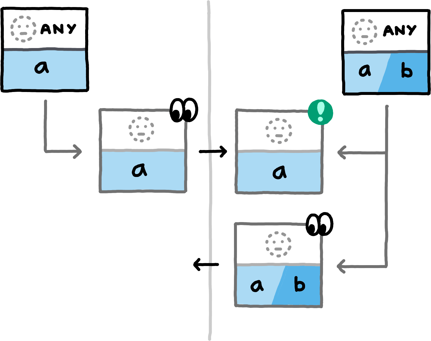 If you replace the concrete examples with the equivalence classes that they represent, you obtain a proof sketch for the correctness of this approach.The examples cover the nine different (up to symmetry) combinations of how subspace_ids and paths can related to each other (equal, non-equal, or any for subspace_ids, prefix, extension, or unrelated for paths). Note that in all examples, both peers also locally compute hashes for PrivateInterests with the empty Path. For brevity we do not depict those, since in these examples they never match any transmitted hashes.